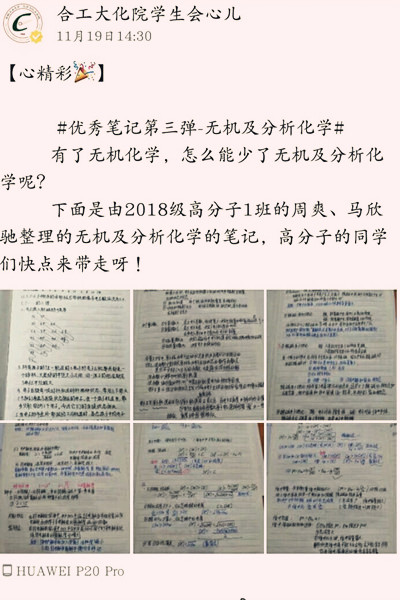 为选树优秀典型,分享学习经验,学院面向低年级全体同学在线上开展“笔记共习,知识互益”优秀笔记分享活动。在活动准备阶段,各班级学习委员在班级内部对本次活动进行了大力宣传,动员同学们积极分享,班级同学热情响应。班委会对班级同学提交的大量笔记进行了初步筛选,进行拍照及排序,随后,将初选后的笔记上传至学习资料交流群中,从字迹是否工整、复习重点是否明确突出、排版是否详略得当等多角度进行考察与评定,优中择优,最后综合投票从各学科遴选出一份优秀笔记,通过学院学生会心儿公众号发布推送进行分享。