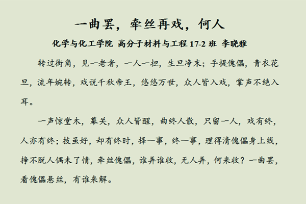 4月29日,学院“集手工传统,展华夏文明”微故事征集大赛结果公布,经专项小组评审、网络投票等环节,来自体育在线365手机版李晓雅同学的作品《一曲罢,牵丝再戏,何人》获得一等奖,体育在线365手机版李翔同学的《捏糖人的老头》等两份作品获二等奖,管理学院邹雪戈同学的《一剪之巧夺天工,美在人间永不朽》等三份作品获得三等奖,仪器学院的杨玉龙《天青色等烟雨》等四份作品获得优秀奖。