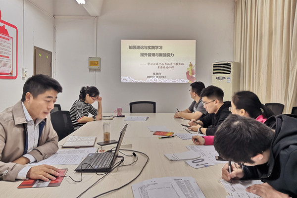 根据学校“不忘初心、牢记使命”主题教育的有关要求,结合学院主题教育工作进度的安排,2019年10月23日下午,在学院行政楼103党员活动室,学院党委副书记、副院长陈树海为行政教工党支部全体党员讲授了以《加强理论与实践学习,提升管理与服务能力》为题的专题党课。