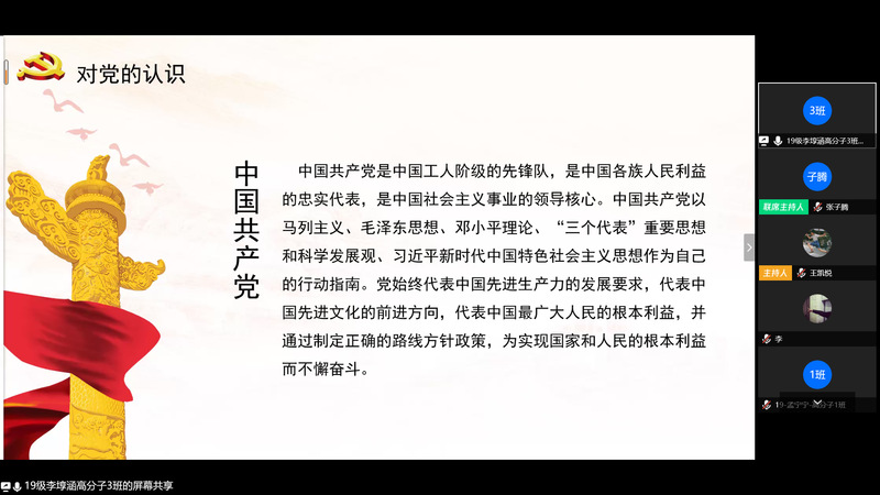 此次党员发展公开答辩是本科生各专业党支部在疫情防控期间召开的一次特殊答辩会,以全新的网上答辩方式严格筛选本学期将要发展的党员,参加答辩的同学也通过展示个人思想、学习、工作和生活经历,进行了一个较为全面的自我总结,既促进了同学之间相互交流学习,也引导同学们在入党过程中要时刻做到脚踏实地,不仅要在行动上入党,更要在思想上入党,不忘初心,砥砺前行,通过自身的辛勤汗水和真心诚意争取早日加入党组织,为人民和国家服务。
