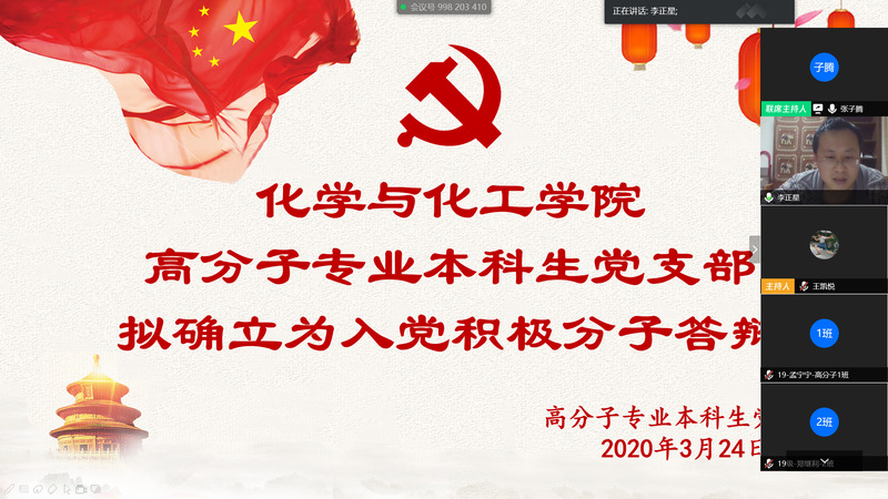 为规范党员发展流程,落实“三答辩三投票三公示一承诺”的制度,确保疫情防控期间的党员按期保质发展,3月24日,体育在线365手机版高分子材料与工程专业本科生党支部、化学工程与工艺专业本科生党支部和应用化学专业本科生党支部,使用腾讯会议,以网络视频会议的方式举行了入党积极分子公开答辩会,2019级辅导员李正星老师、各支部正式党员、预备党员和2019级各团支部的42名优秀共青团员参会。