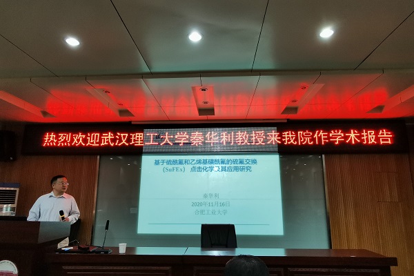 11月16日下午,武汉理工大学秦华利教授应邀前来体育在线365手机版进行了题为“基于硫酰氟和乙烯基磺酰氟的硫氟交换点击化学及其应用”的学术报告,报告于升华楼616举行,由常务副院长陆杨教授主持,参会师生约60余人。