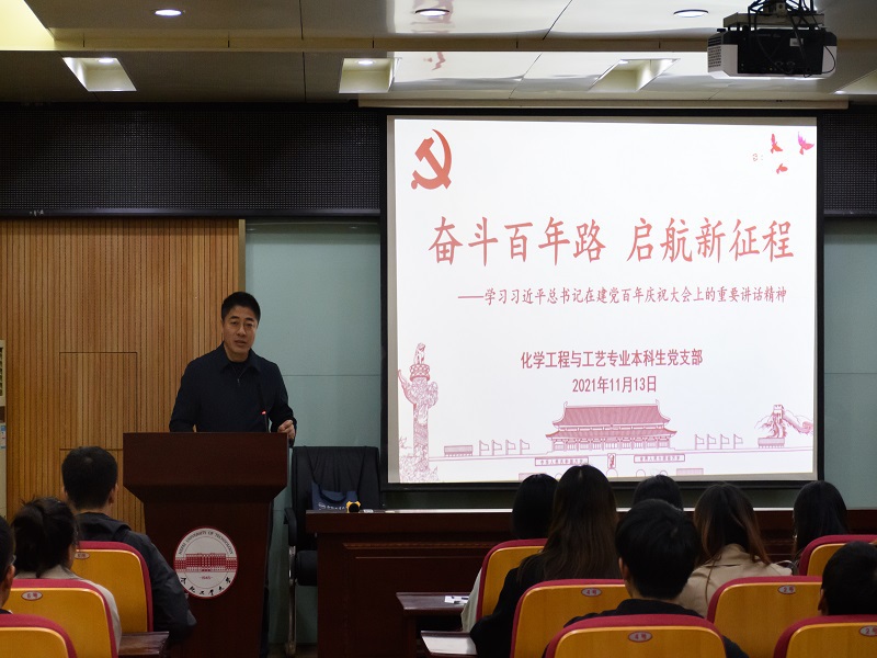 为持续深入推进党史学习教育,11月13日晚,党委学生工作部副部长陈树海为体育在线365手机版化学工程与工艺专业本科生党支部全体党员和党校66期发展对象班学员讲授了题为“奋斗百年路,启航新征程”的专题党课。