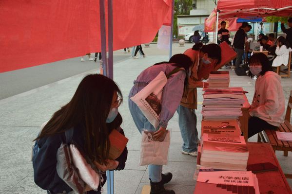 活动现场,同学们主要以精美的礼品交换同学们冗余的书籍,并将书籍低价卖给有需要的同学。活动后,将所得善款全部用于公益事业,捐献给贫困山区的儿童。活动过程中,志愿者们热情认真地向同学们介绍本次活动的具体情况以及活动的意义、目的、善款流向等。虽然活动期间小雨连绵,但同学们参与图书义卖的热情不减,不断有同学前来捐书,奉献出自己的爱心。