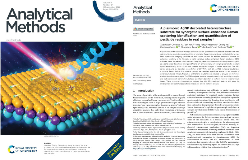 近日,体育在线365手机版2019级能源化学工程专业本科生在分析类著名期刊《Analytical Methods》发表了题为“A plasmonic AgNP decorated heterostructure substrate for synergetic surface-enhanced Raman scattering identification and quantification of pesticide residues in real samples”学术论文一篇,并被选为当期正封面报道。该项工作由我校微纳生化传感材料与器件实验室与中国科学院合肥物质科学研究院和安徽拓维检测服务有限公司合作完成,体育在线365手机版为第一完成单位和通讯单位,我院本科生李雪婷为第一作者,张茂峰副教授、吴玉程教授为校内通讯作者。近年来,研发团队高度重视本科生科研能力的提高和科研素质的养成,以大学生创新创业项目和互联网+大赛为依托,在大一新生中遴选热爱科研、勤于钻研的优秀学生进入课题组,通过教师指导、研究生传帮带的形式,全方位提升本科生的科研素养,截止目前本课题组培养的本科生已在ACS Sensors, Journal of Materials Chemistry C等国际期刊发表10篇论文。