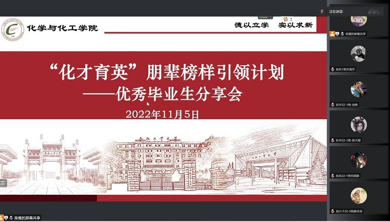 此次优秀毕业生分享会丰富了该院“化才育英”朋辈榜样引领计划内容,通过充分发挥学院优秀毕业生“传帮带”作用,引导低年级学生加深对化工专业的了解、思考和认可,激励同学们努力向榜样看齐、向优秀学习。
