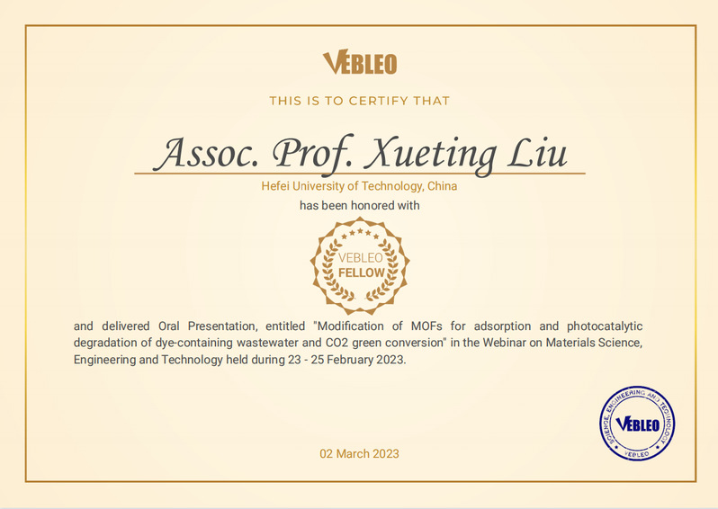 刘雪霆副教授长期以来致力于MOFs材料的设计,合成及应用于染料废水的吸附和光催化净化,应用于低碳型CO2的捕捉与转化为有价化学品的研究。在国内外学术期刊上以第一或通信作者发表学术论文约60篇,其中SCI收录论文约30篇。刘雪霆副教授被授予VEBLEO FELLOW,说明我校MOFs材料应用于环境净化和修复方面的研究工作得到了国内外同行的认可,提升了该领域的国际影响力。