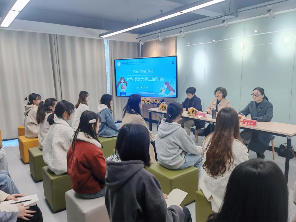 3月3日,学院在翡翠湖校区一号楼学生社区举行了以“阳光、自信、快乐”为主题的女教授与女大学生面对面交流活动,魏凤玉教授、吴雪平教授、张传玲教授与来自学院各专业的二十余名女同学进行了面对面交流,2022级辅导员柴赛主持本次活动。