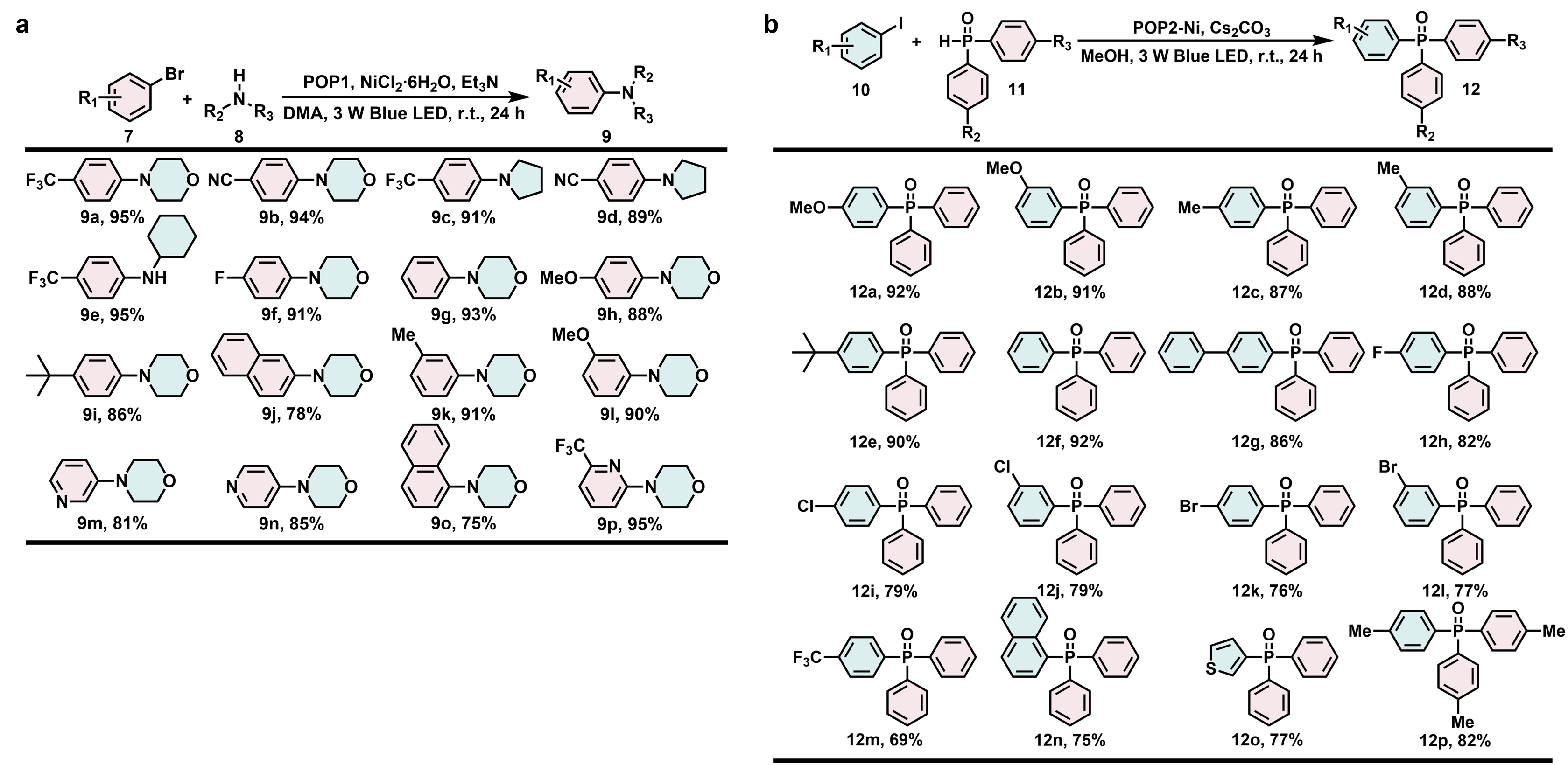 图3 (a) POP1 + NiCl2组合催化C-N键生成反应;(b) POP2-Ni催化C-P键生成反应。