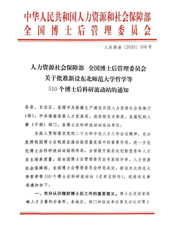 近日,人力资源和社会保障部、全国博士后管委会联合下发《关于批准新设东北师范大学哲学等510个博士后科研流动站的通知》(人社部函〔2023〕108号)。在全国新一轮增设博士后科研流动站工作中,体育在线365手机版化学工程与技术博士后科研流动站成功获批,代表体育在线365手机版在化学工程与技术领域的科研和人才培养工作迈出了重要一步,是学科声誉的重要彰显。