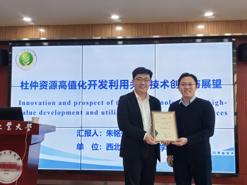 朱铭强教授以“杜仲资源高值化开发利用关键技术创新与展望”为题,从植物资源在食品、医药和功能材料领域应用的前沿出发,以植物资源活性成分的生物合成规律和提取为切入点,针对产业化开发,围绕资源培育、高效利用、功效开发和全产业链效益等方面,多维度解析资源集约化、采收智能化、利用精细化、过程绿色化和产品高值化的基础机制和产业实践路径。在报告过程中,朱铭强教授与师生分享了在科学研究、产业转化中的切身体会以及创新创业大赛的经验心得,提出在科研过程中应聚焦国家重大战略需求和经济主战场,加强团队合作,用积极向上的态度,敢于有梦、勇于追梦、勤于圆梦。