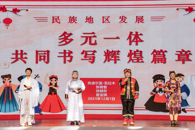 《多元一体,共同书写辉煌篇章》以演讲的形式展开。来自四个民族的四位同学,讲述着各族人民听党话,感党恩,跟党走,共谋发展,协力脱贫的伟大故事,讲出了新时代各地区发展的伟大征程,表明了新时代少数民族青年以身报家乡的坚定决心!参演的四位同学被聘为2023年”斛兵石榴红学生宣讲团”成员。