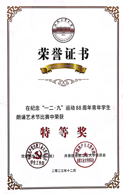 体育在线365手机版在“纪念‘一二•九’运动88周年青年学生朗诵艺术节”比赛中斩获特等奖