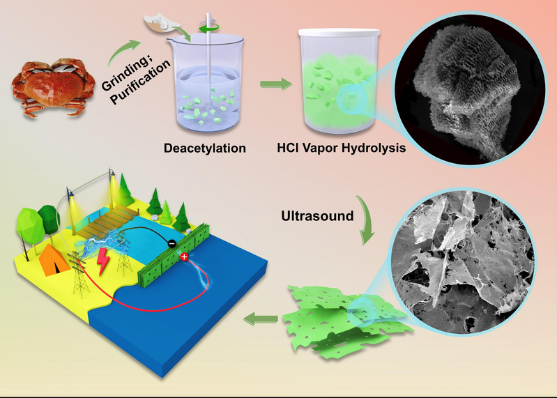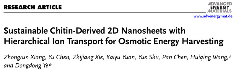 近日,体育在线365手机版王慧庆副教授课题组与安徽农业大学叶冬冬教授课题组合作,研发出一种全甲壳素多孔纳米片层叠膜基渗透能收集器件,实现全生物质体系在该应用领域输出功率密度性能的突破,相关成果以“Sustainable Chitin-Derived 2D Nanosheets with Hierarchical Ion Transport for Osmotic Energy Harvesting”为题,发表在国际著名期刊《Advanced Energy Materials》(IF=27.8) 。我校体育在线365手机版2021级硕士研究生向忠润为论文第一作者。