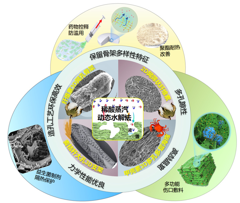 近年,王慧庆副教授团队致力于生物质(棉纤维、麦秸秆、蟹壳、虾壳、鱿鱼骨)多样性骨架结构特征下纳米新材料开发,开发并发展了生物质造孔新方法—稀酸蒸汽“动态”水解法(Carbohyd. Polym, 2024, 323, 121370.),已在3D、2D、1D多维度纳米新结构材料研究上获得系列进展,并尝试为生物质骨架多维度纳米新材料寻找贴合生物质产业高附加值导向的应用研究,如抑制违禁药物提取(Ind.Crop.Prod, 2023, 197, 116580.)、生物聚酯耐热改性剂(CN202210585854.5) 、伤口敷料等。并发现生物质纳米通道离子传输性能的前沿研究价值,发展了生物质在渗透能收集应用(Nano Energy, 2024, 109450.)。