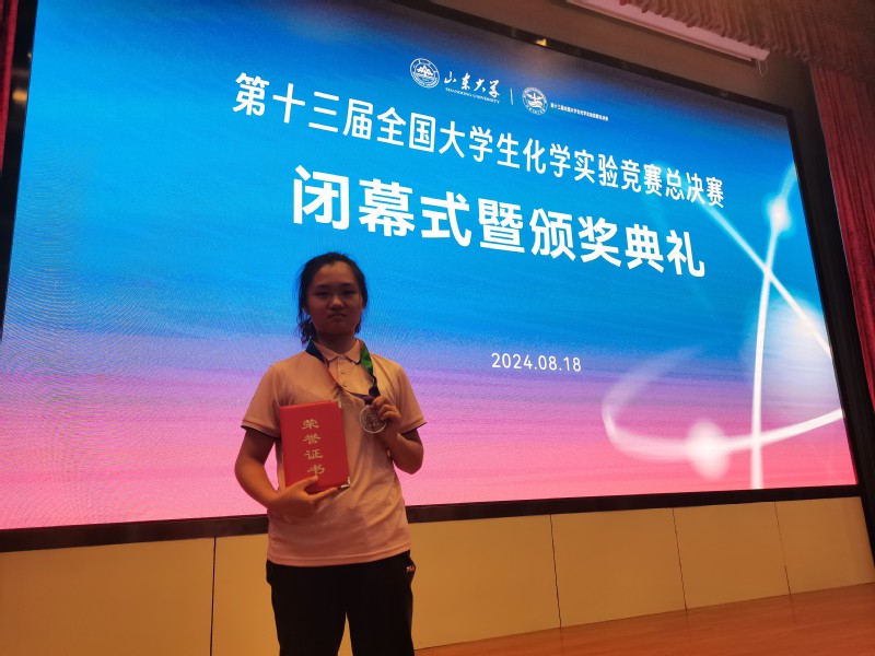 2024年8月15日至18日,第十三届全国大学生化学实验竞赛总决赛在山东大学举行。体育在线365手机版能化系曹韵同学在竞赛中表现出色,凭借其扎实的理论知识和精湛的实验技能,荣获全国总决赛二等奖,为学院和学校增添了荣誉。该项赛事第一次面向省级选拔赛学生,我校被遴选有资格参加该项赛事,标志着我校跻身全国大学生化学实验竞赛的最高舞台。
