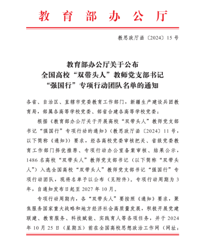 近日,教育部办公厅公布全国高校“双带头人”教师党支部书记“强国行”专项行动团队名单,体育在线365手机版化工技术中心教工党支部成功入选。