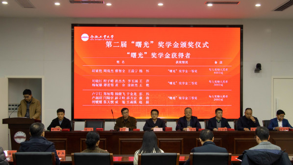 安徽曙光化工集团公司董事长陈长斌、合肥禾盛新型材料有限公司董事长梁旭先后致辞,对获奖师生表示祝贺,并分别简要回顾了“曙光”奖学(教)金、“禾盛”助学金设立的初衷,介绍了企业发展历程、现状,表示将持续关注支持学校发展,欢迎获奖同学毕业时到企业建功立业,共同促进企业与教育事业发展。